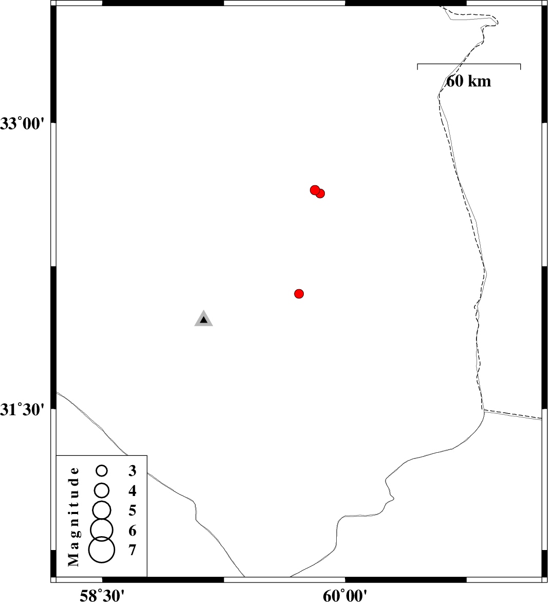 | 2015/08/28 | 14:55:22.4 | 19:25:22.4 | 32.649 | 59.813 | 6 | ML2.7 | Khorasan(south) Province, 4 km of Sarbisheh | ||