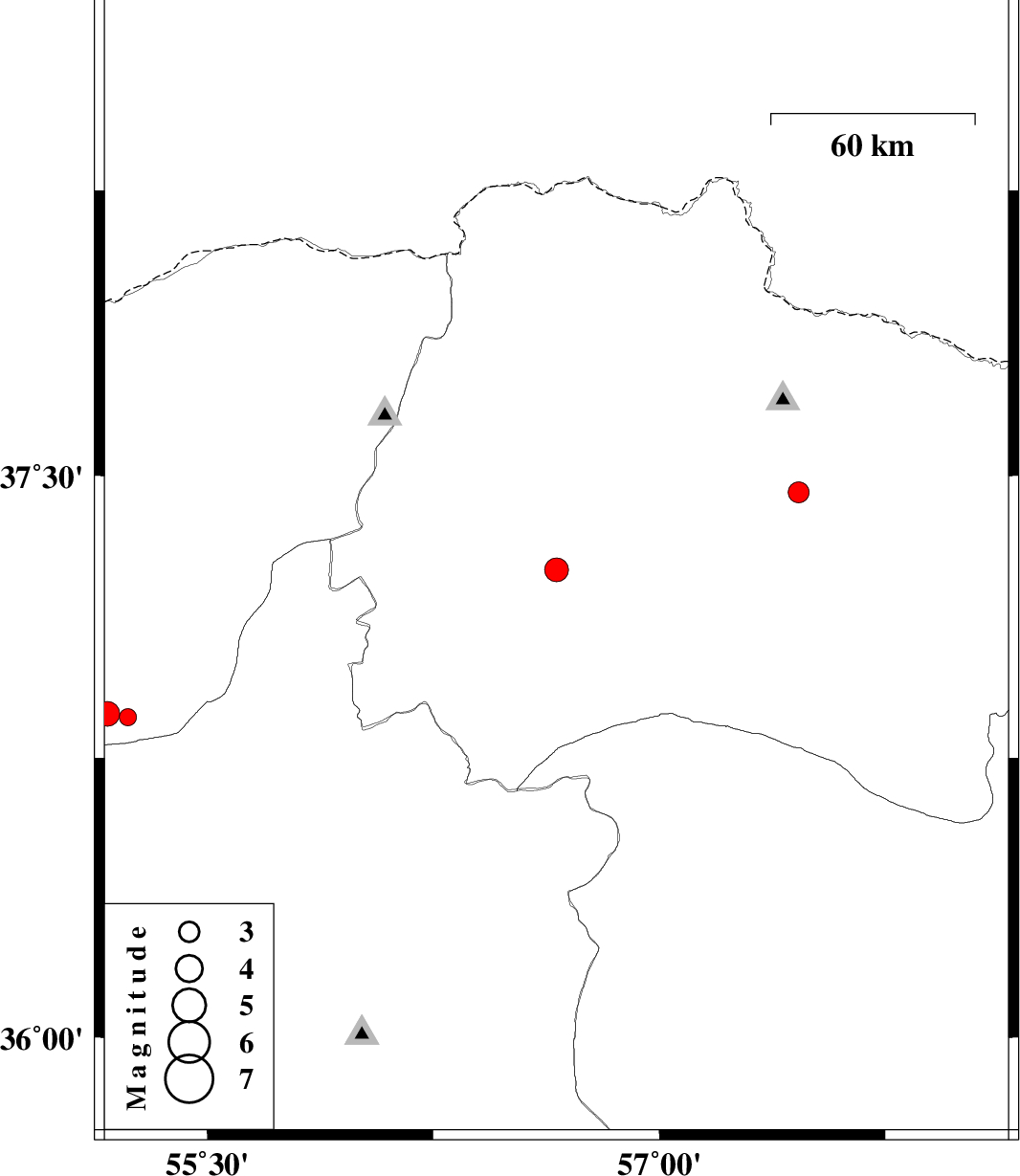 | 2015/08/27 | 20:45:17.1 | 01:15:17.1 | 37.251 | 56.659 | 15 | ML3.5 | Khorasan(north) Province, 41 km North-East of Jajarm | ||