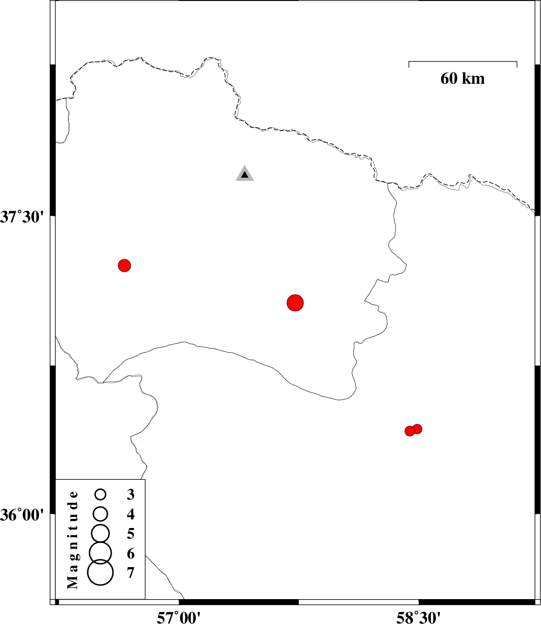 | 2015/08/27 | 20:45:17.1 | 01:15:17.1 | 37.251 | 56.659 | 15 | ML3.5 | Khorasan(north) Province, 41 km North-East of Jajarm | ||