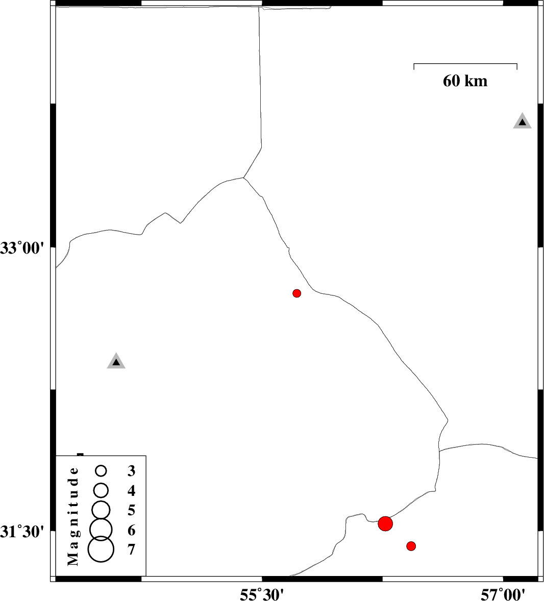 | 2015/08/25 | 06:17:10.8 | 10:47:10.8 | 31.537 | 56.267 | 14 | ML4.1 | Kerman Province, 60 km North-West of Ravar |
