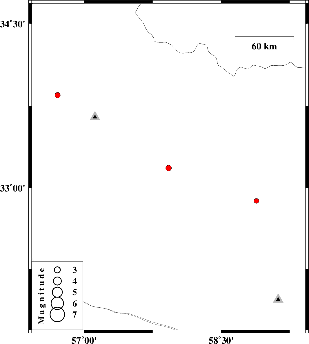 | 2015/09/05 | 00:35:17.2 | 05:05:17.2 | 32.88 | 58.888 | 16 | ML2.4 | Khorasan(south) Province, 32 km -West of Birjand | ||