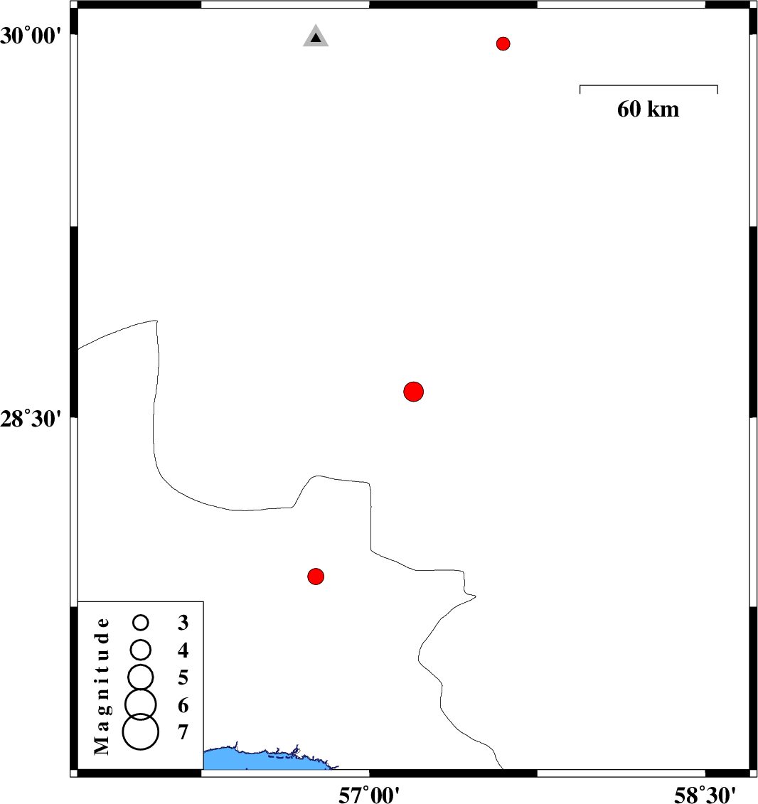 | 2015/09/04 | 04:28:26.6 | 08:58:26.6 | 27.87 | 56.76 | 14 | ML3.2 | Hormozgan Province, 68 km North-West of Dehbarez |