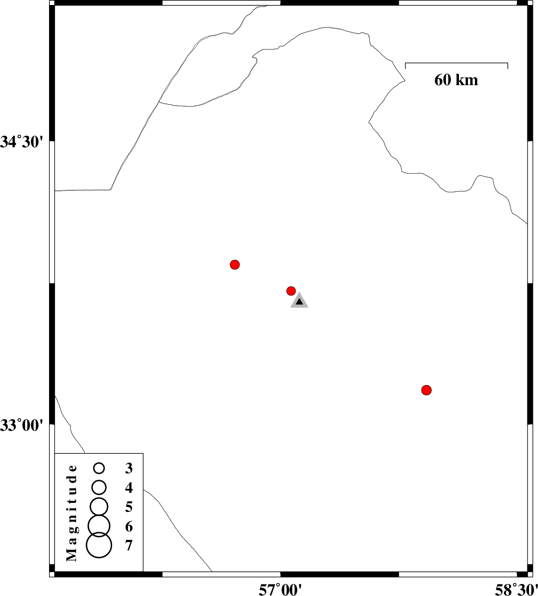 | 2015/08/11 | 20:04:57.3 | 00:34:57.3 | 33.849 | 56.709 | 14 | ML2.7 | Yazd Province, 34 km North-West of Tabas |