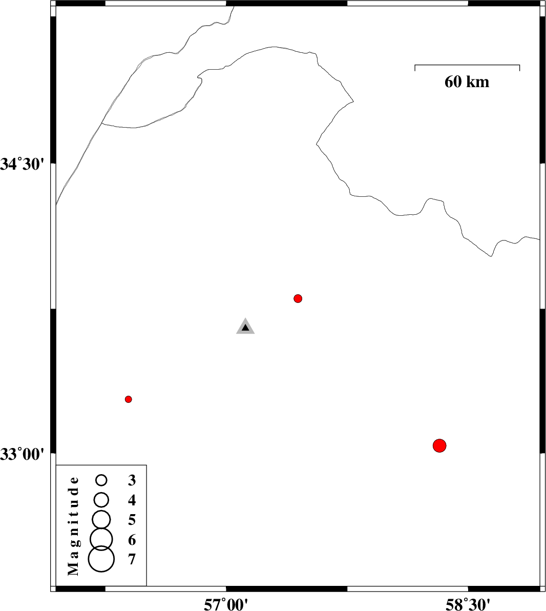 | 2015/09/11 | 08:02:39.7 | 12:32:39.7 | 33.281 | 56.393 | 14 | ML1.8 | Yazd Province, 61 km South-West of Tabas |