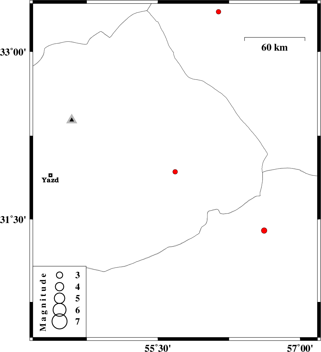 | 2015/09/27 | 09:05:15.3 | 12:35:15.3 | 31.927 | 55.682 | 9 | ML2.2 | Yazd Province, 45 km North-East of Bafq | ||