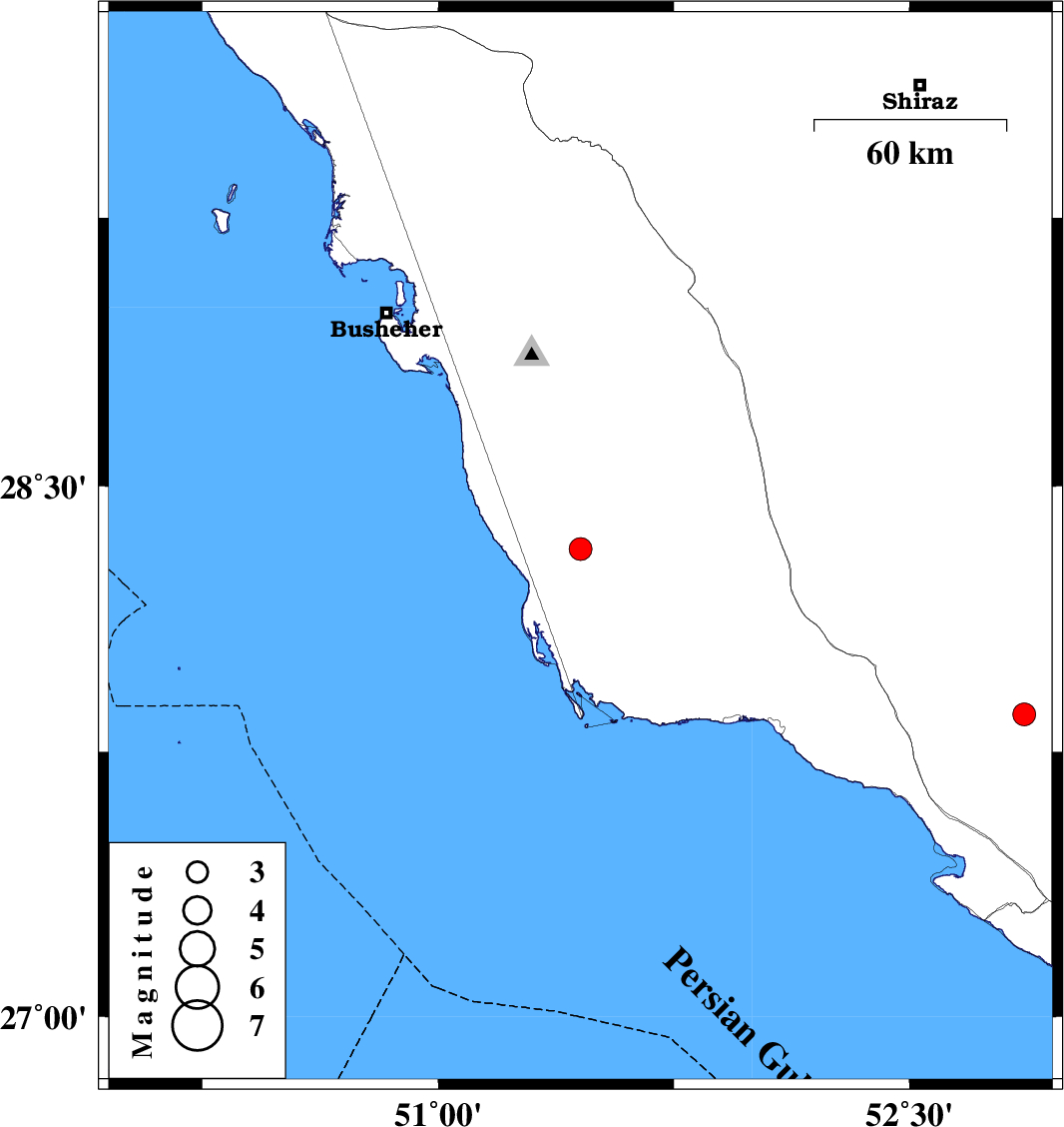 | 2015/09/29 | 18:58:10.7 | 22:28:10.7 | 27.857 | 52.864 | 14 | ML3.2 | Fars Province, 35 km North of Mehr |