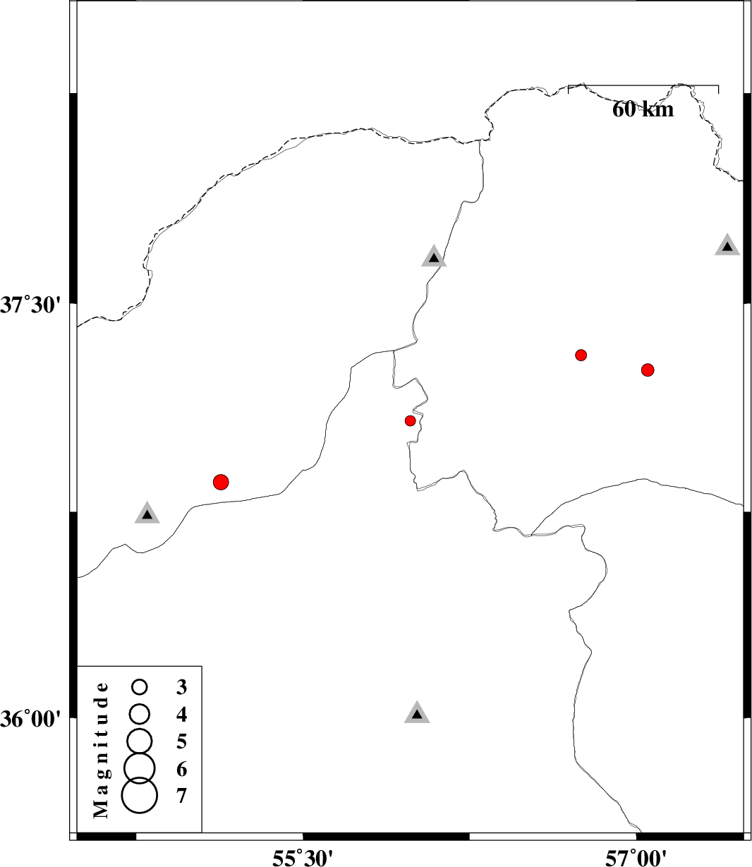 | 2015/09/30 | 16:15:51.0 | 19:45:51.0 | 37.078 | 55.983 | 14 | ML2.1 | Semnan Province, 39 km North-West of Jajarm | ||