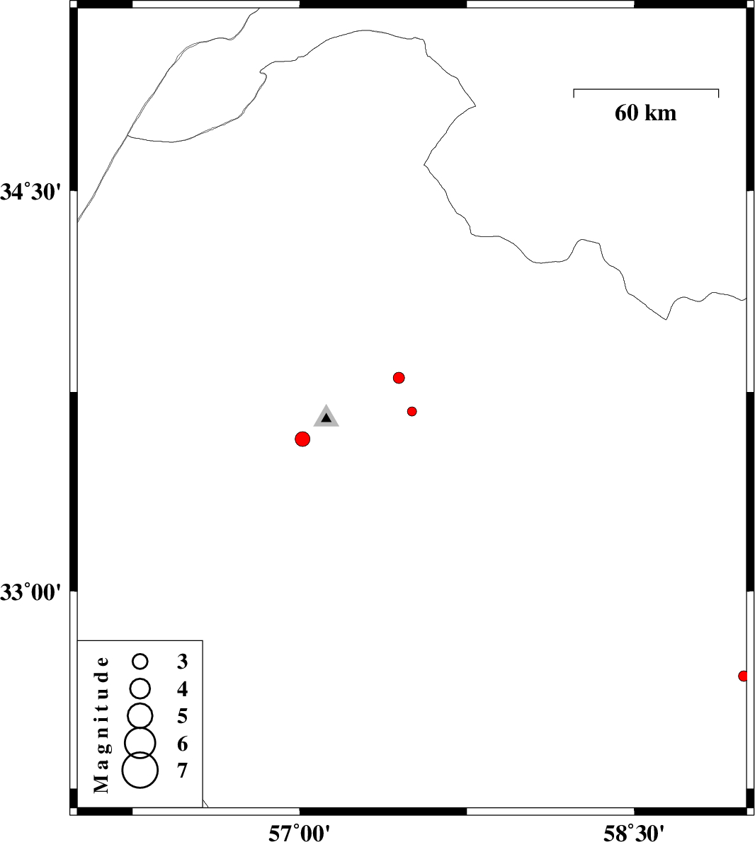 | 2015/09/18 | 19:27:04.5 | 23:57:04.5 | 33.803 | 57.444 | 15 | ML2.3 | Khorasan(center) Province, 53 km North-East of Tabas | ||