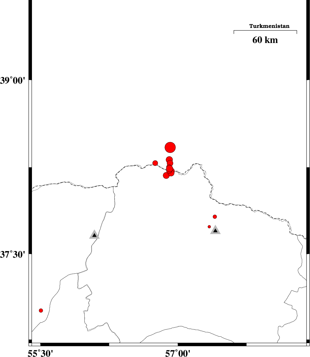 2015/10/11 17:49:39.6 21:19:39.6 37.00555.50518 ML1.8 Golestan Province, 27 km South-East of Minodasht