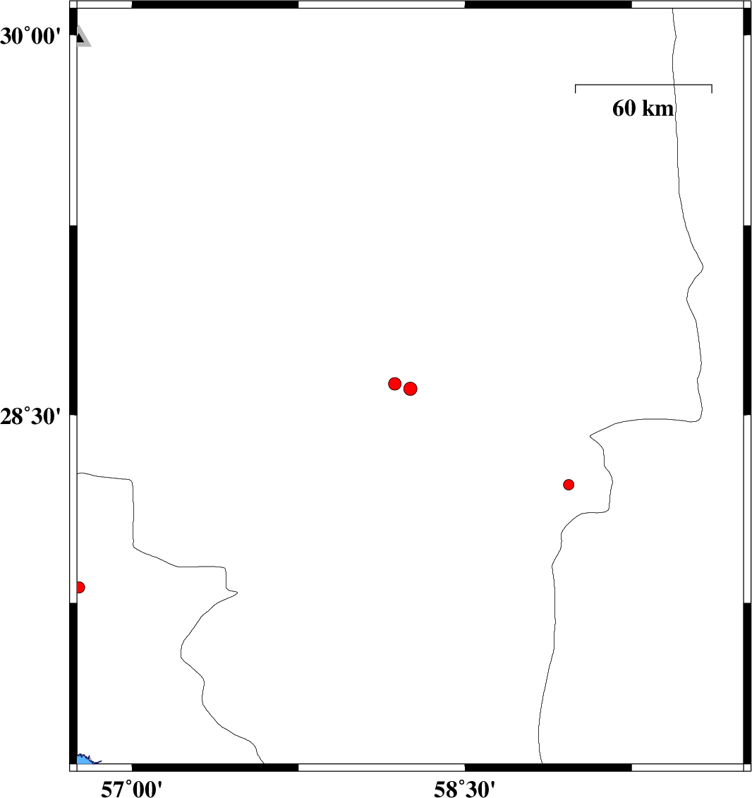 | 2015/10/09 | 09:54:23.9 | 13:24:23.9 | 28.624 | 58.183 | 14 | ML2.6 | Kerman Province, 44 km -East of Jiroft |