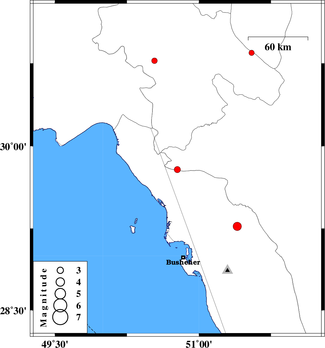 | 2015/10/11 | 01:17:27.9 | 04:47:27.9 | 29.27 | 51.399 | 9 | ML3.9 | Bushehr Province, 19 km -East of Borazjan |
