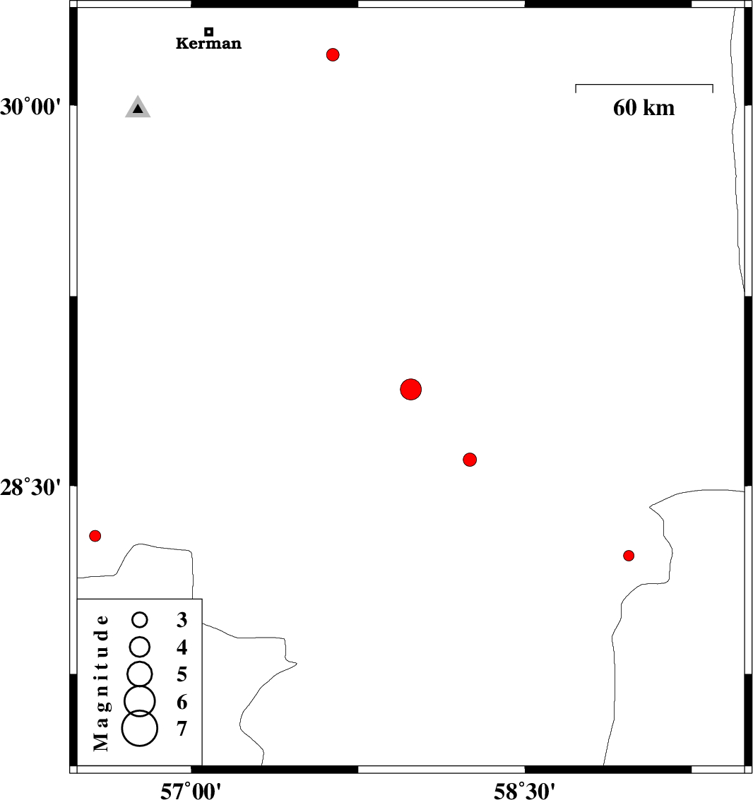 | 2015/10/13 | 01:25:52.2 | 04:55:52.2 | 28.222 | 58.966 | 15 | ML2.1 | Kerman Province, 115 km South-East of Bam |