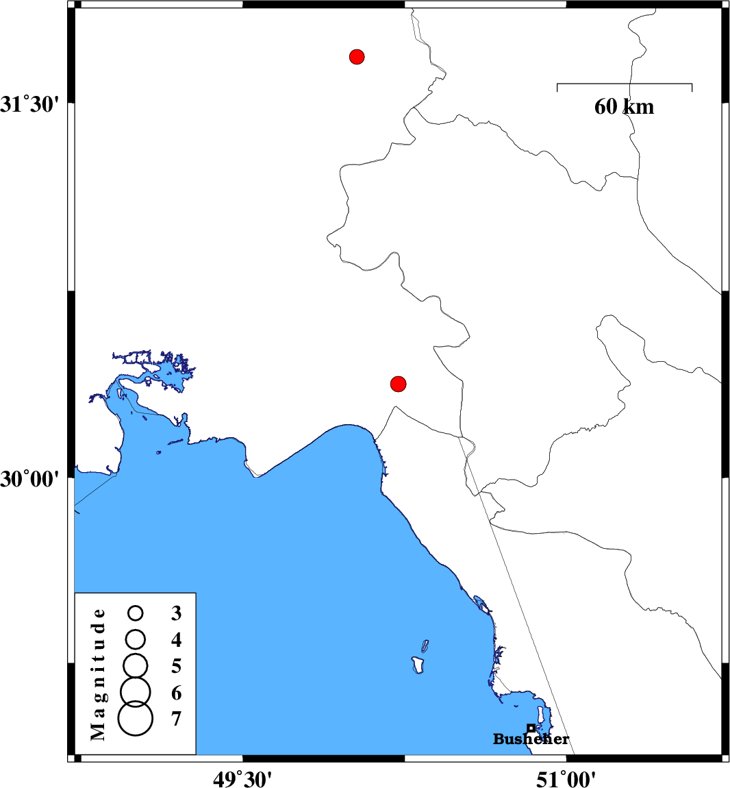 | 2015/10/30 | 06:30:41.9 | 10:00:41.9 | 31.682 | 50.028 | 14 | ML3.1 | Khoozestan Province, 22 km North-East of Bagh Malek |