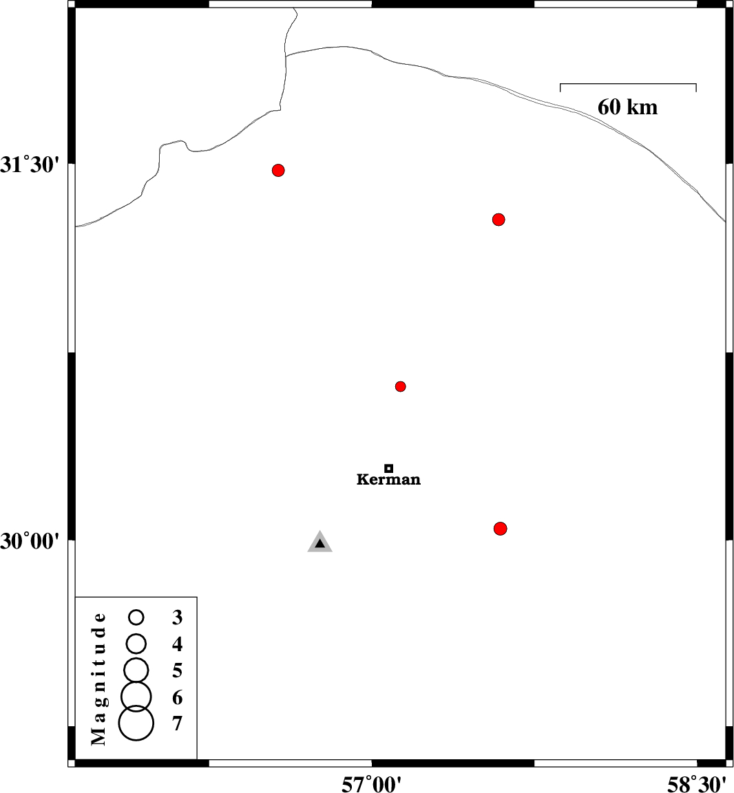 | 2015/11/07 | 17:12:22.5 | 20:42:22.5 | 30.046 | 57.592 | 6 | ML2.7 | Kerman Province, 56 km South-East of Kerman | ||