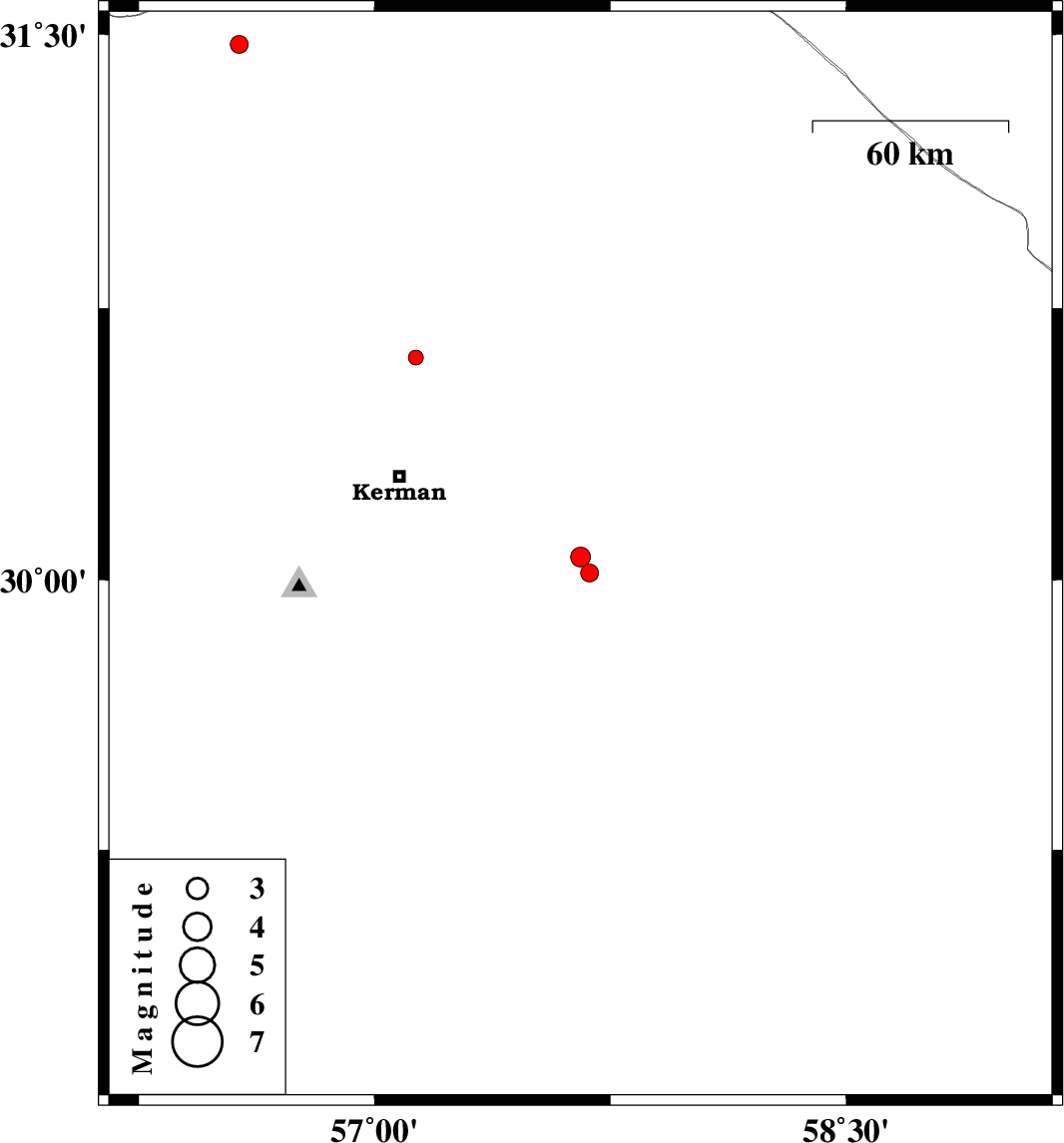 | 2015/11/12 | 08:24:42.0 | 11:54:42.0 | 30.615 | 57.132 | 18 | ML2.1 | Kerman Province, 37 km North of Kerman | ||
