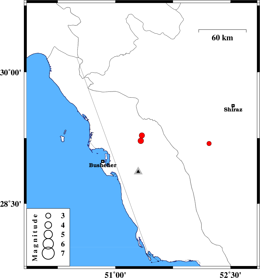 | 2015/11/16 | 06:26:51.8 | 09:56:51.8 | 29.219 | 51.331 | 14 | ML3.4 | Bushehr Province, 13 km -East of Borazjan | ||