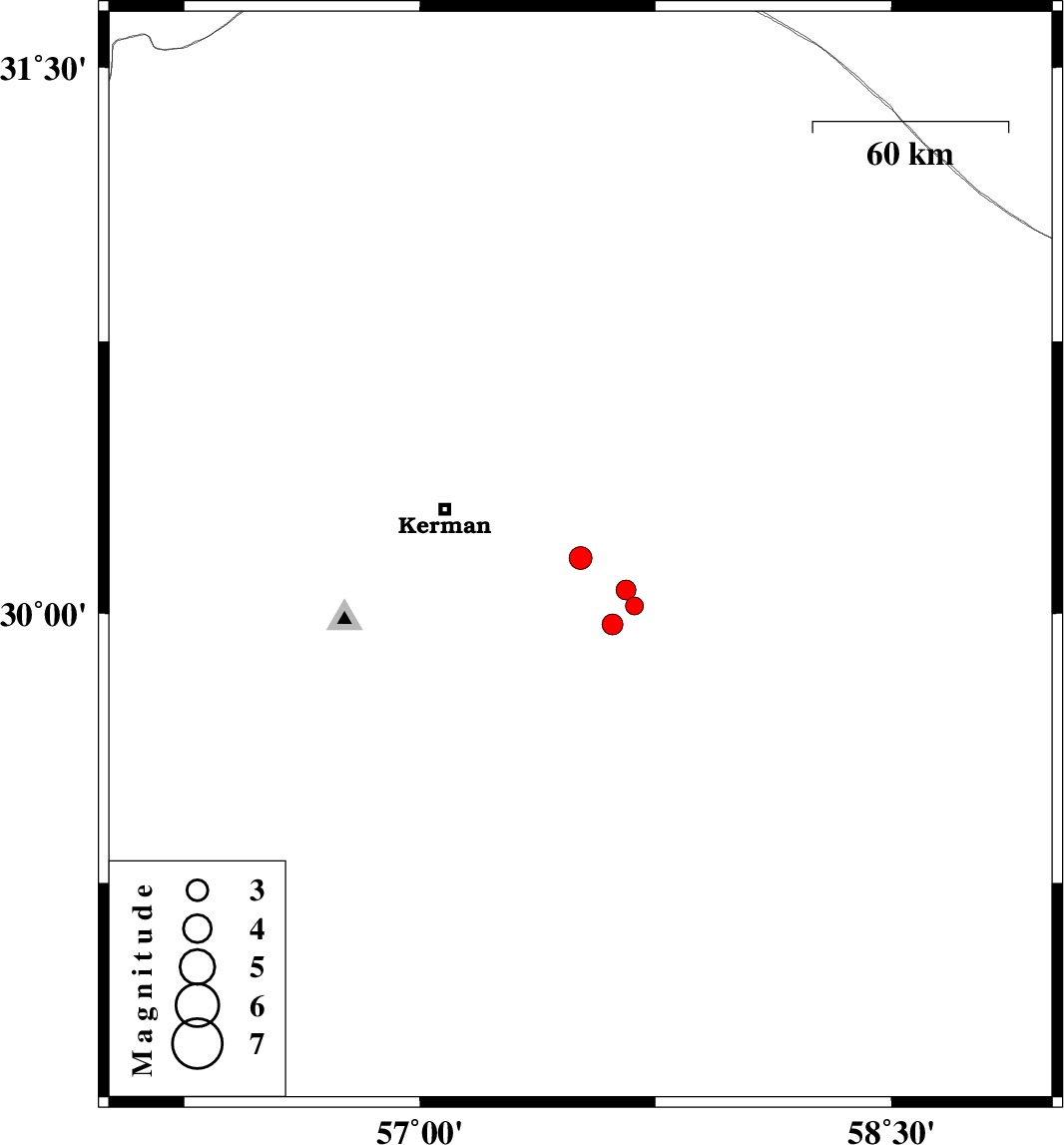 | 2015/11/19 | 15:01:08.7 | 18:31:08.7 | 29.969 | 57.613 | 14 | ML3 | Kerman Province, 62 km South-East of Kerman | ||