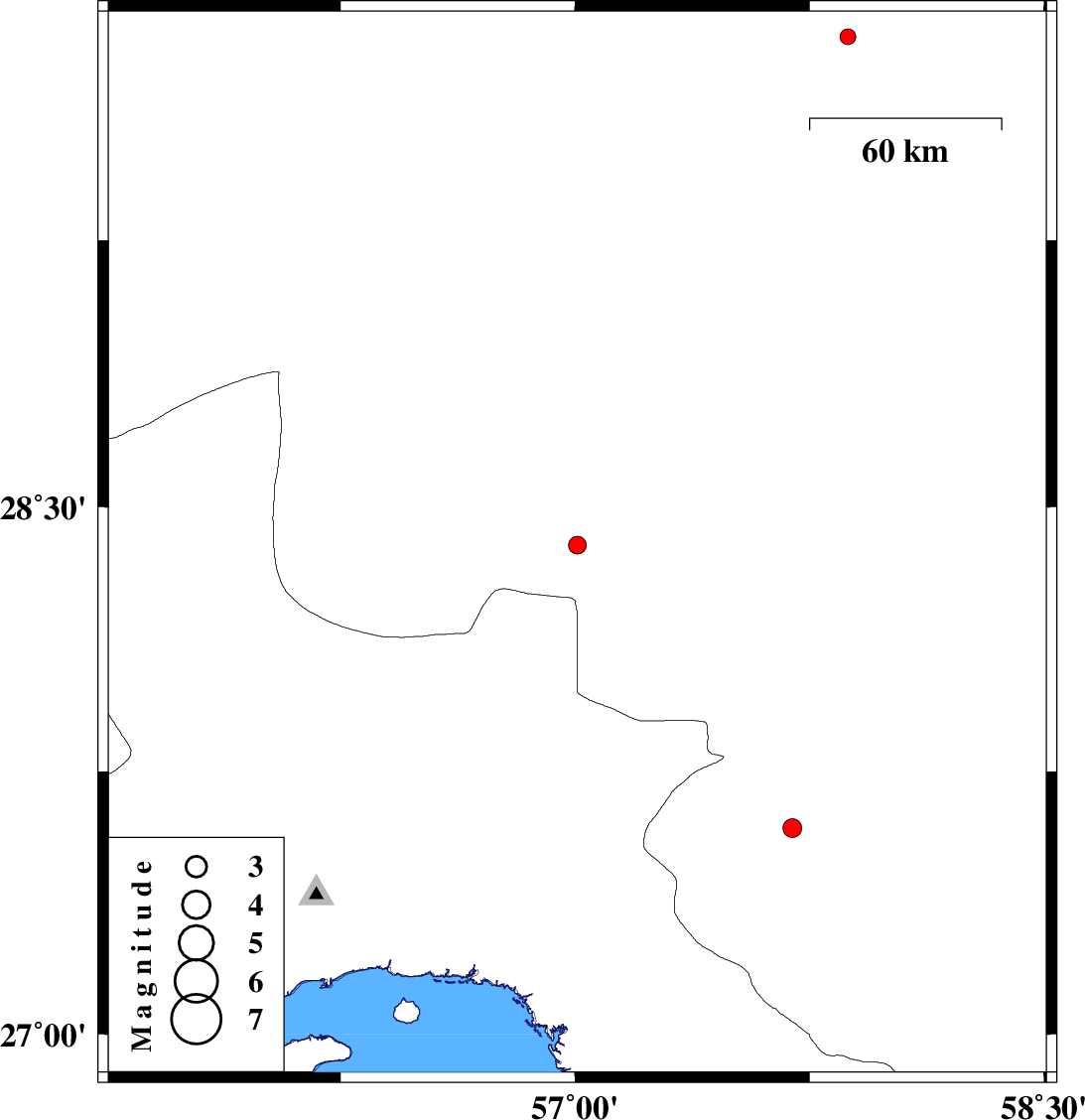 | 2015/11/26 | 22:46:46.8 | 02:16:46.8 | 27.588 | 57.695 | 14 | ML2.7 | Kerman Province, 40 km South of Kahnuj | ||