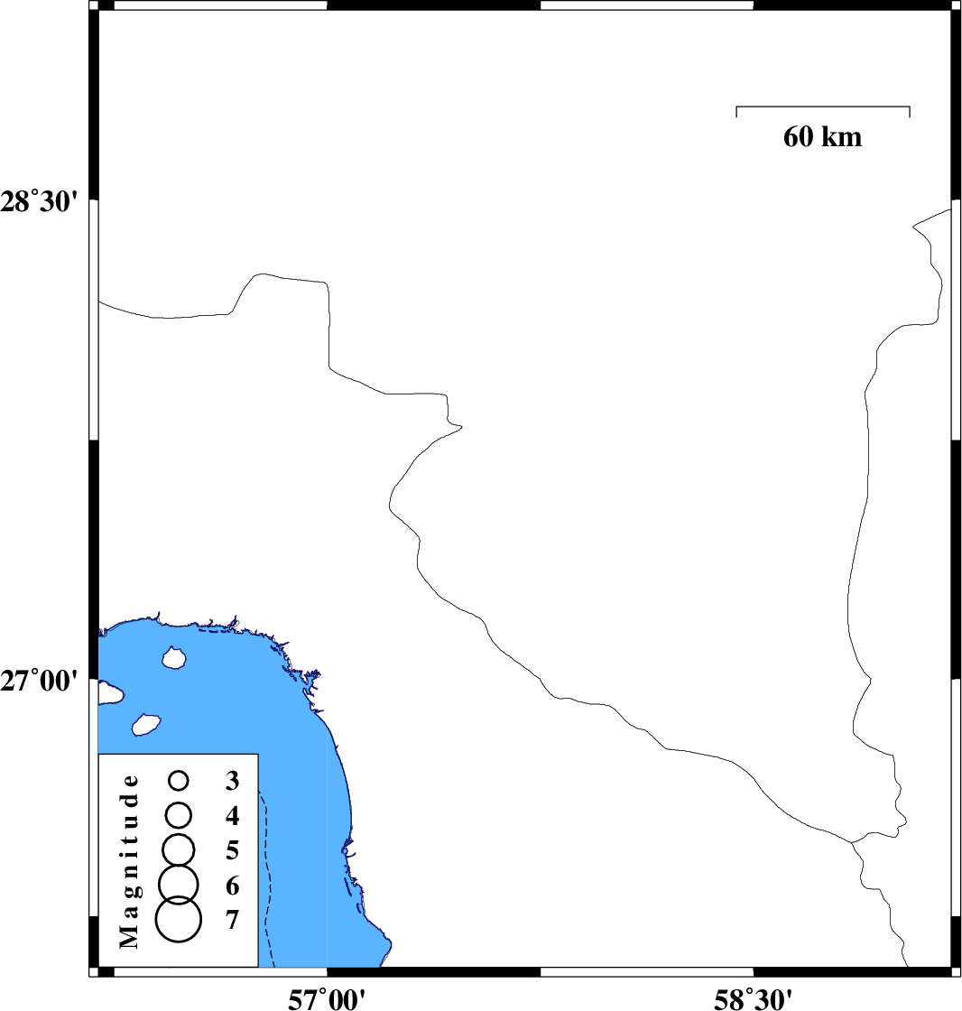 | 2015/11/26 | 22:46:46.8 | 02:16:46.8 | 27.588 | 57.695 | 14 | ML2.7 | Kerman Province, 40 km South of Kahnuj |