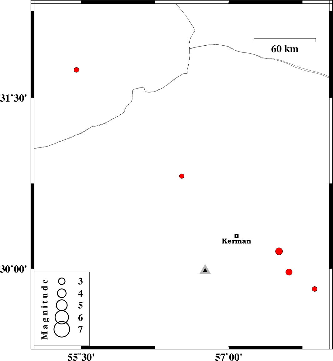 | 2015/11/19 | 15:01:08.7 | 18:31:08.7 | 29.969 | 57.613 | 14 | ML3 | Kerman Province, 62 km South-East of Kerman |