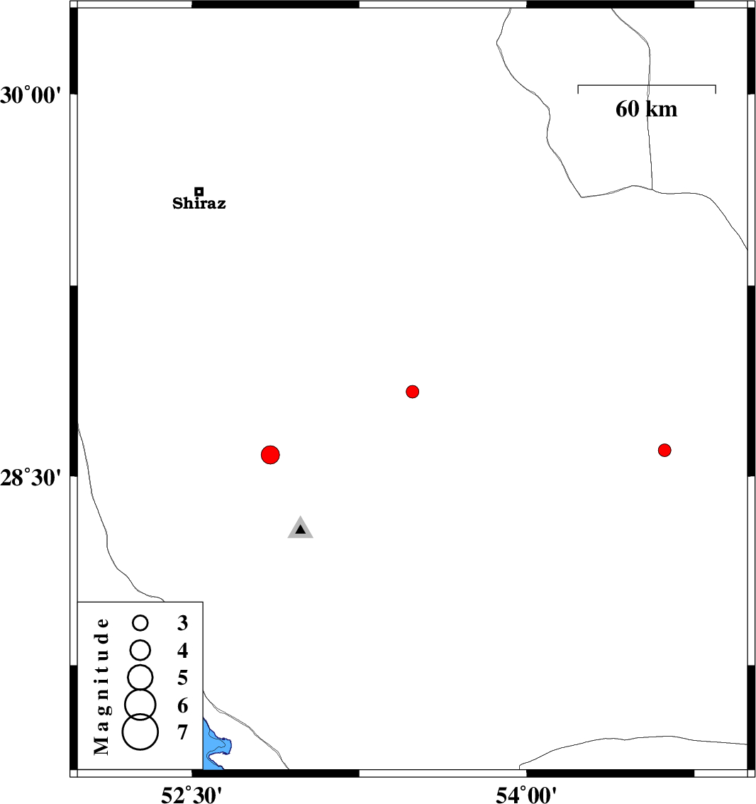 | 2015/11/28 | 15:32:47.0 | 19:02:47.0 | 28.584 | 52.852 | 14 | ML3.6 | Fars Province, 22 km North-West of Qir va Karzin |