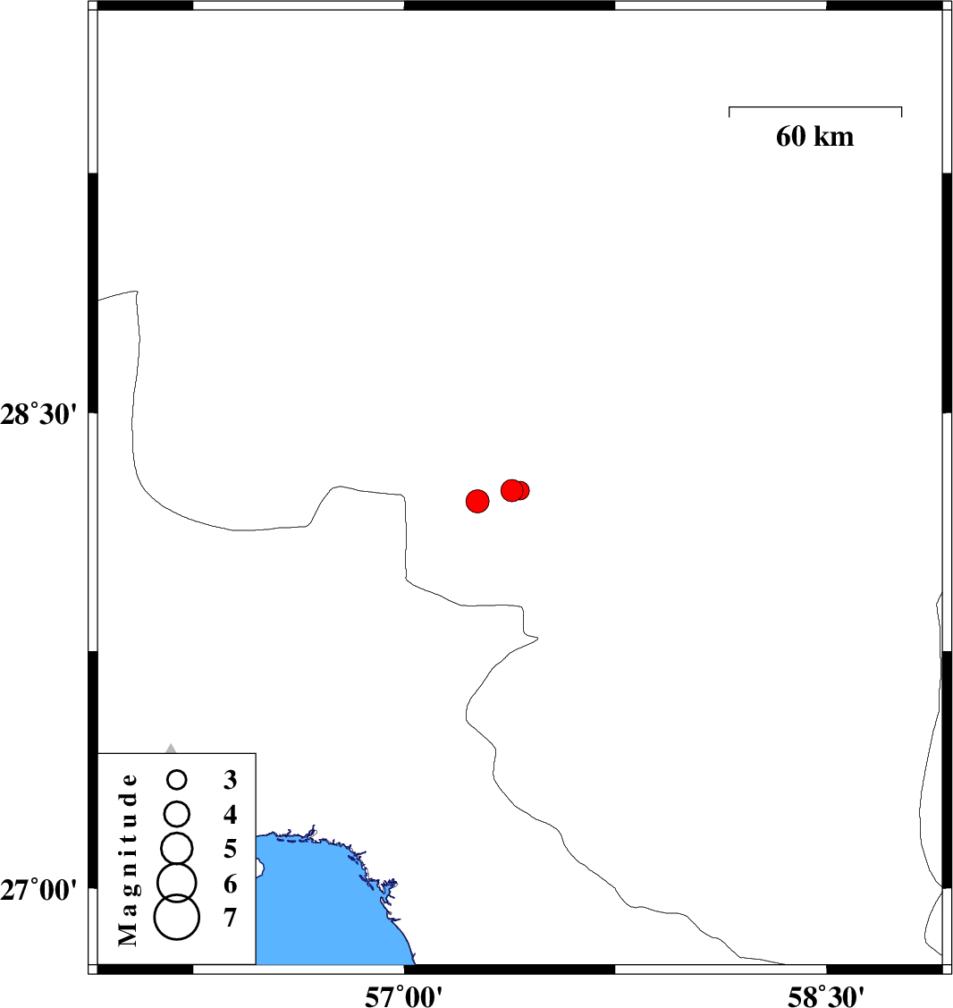 | 2015/12/05 | 15:59:38.4 | 19:29:38.4 | 28.223 | 57.261 | 15 | ML3.6 | Kerman Province, 52 km North-West of Kahnuj |