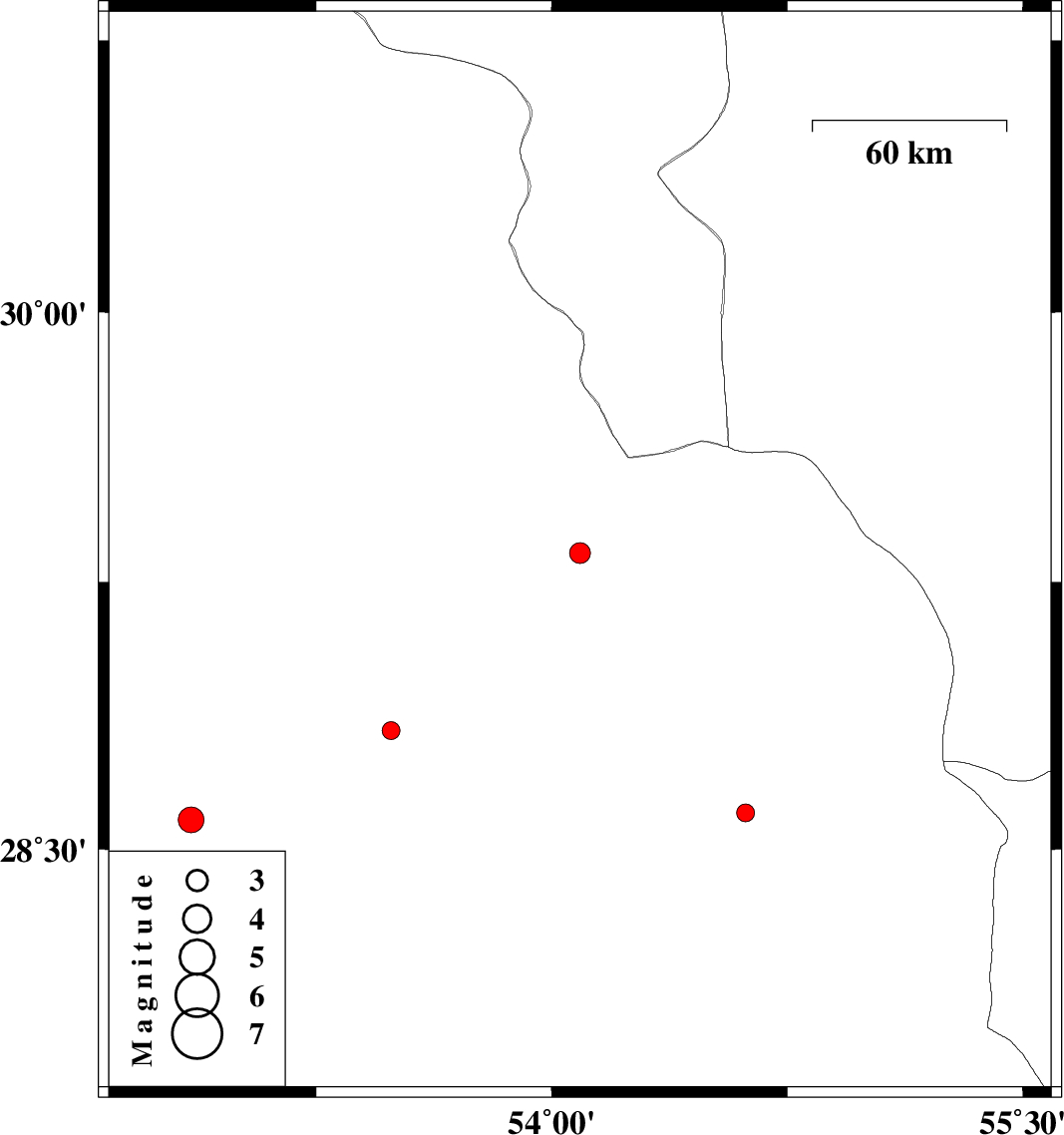 | 2015/11/28 | 15:32:47.0 | 19:02:47.0 | 28.584 | 52.852 | 14 | ML3.6 | Fars Province, 22 km North-West of Qir va Karzin |