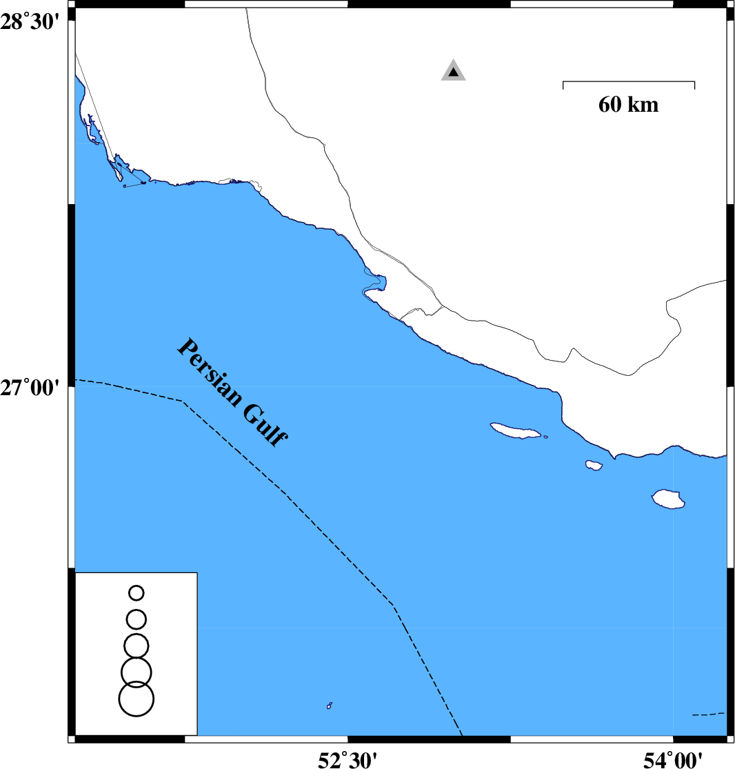 | 2015/12/16 | 10:46:31.6 | 14:16:31.6 | 27.052 | 52.745 | 28 | ML3.3 | Persian Gulf, 57 km South-West of Mehr |