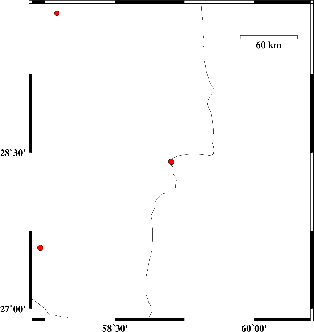 | 2015/11/26 | 22:46:46.8 | 02:16:46.8 | 27.588 | 57.695 | 14 | ML2.7 | Kerman Province, 40 km South of Kahnuj | ||