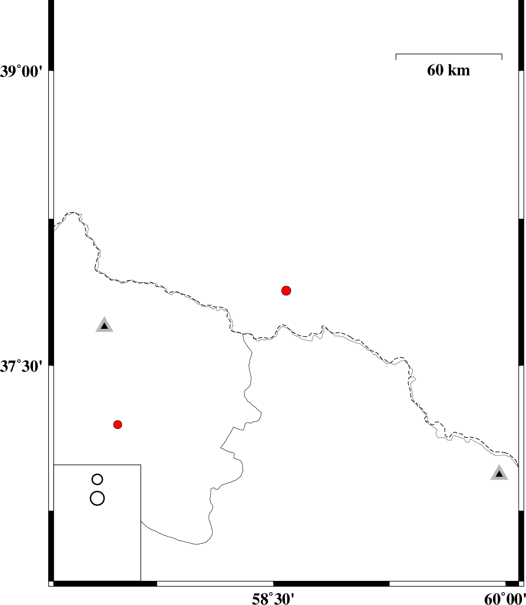 | 2015/12/05 | 21:51:39.7 | 01:21:39.7 | 37.196 | 57.495 | 14 | ML2.4 | Khorasan(north) Province, 15 km North of Esfarayen |
