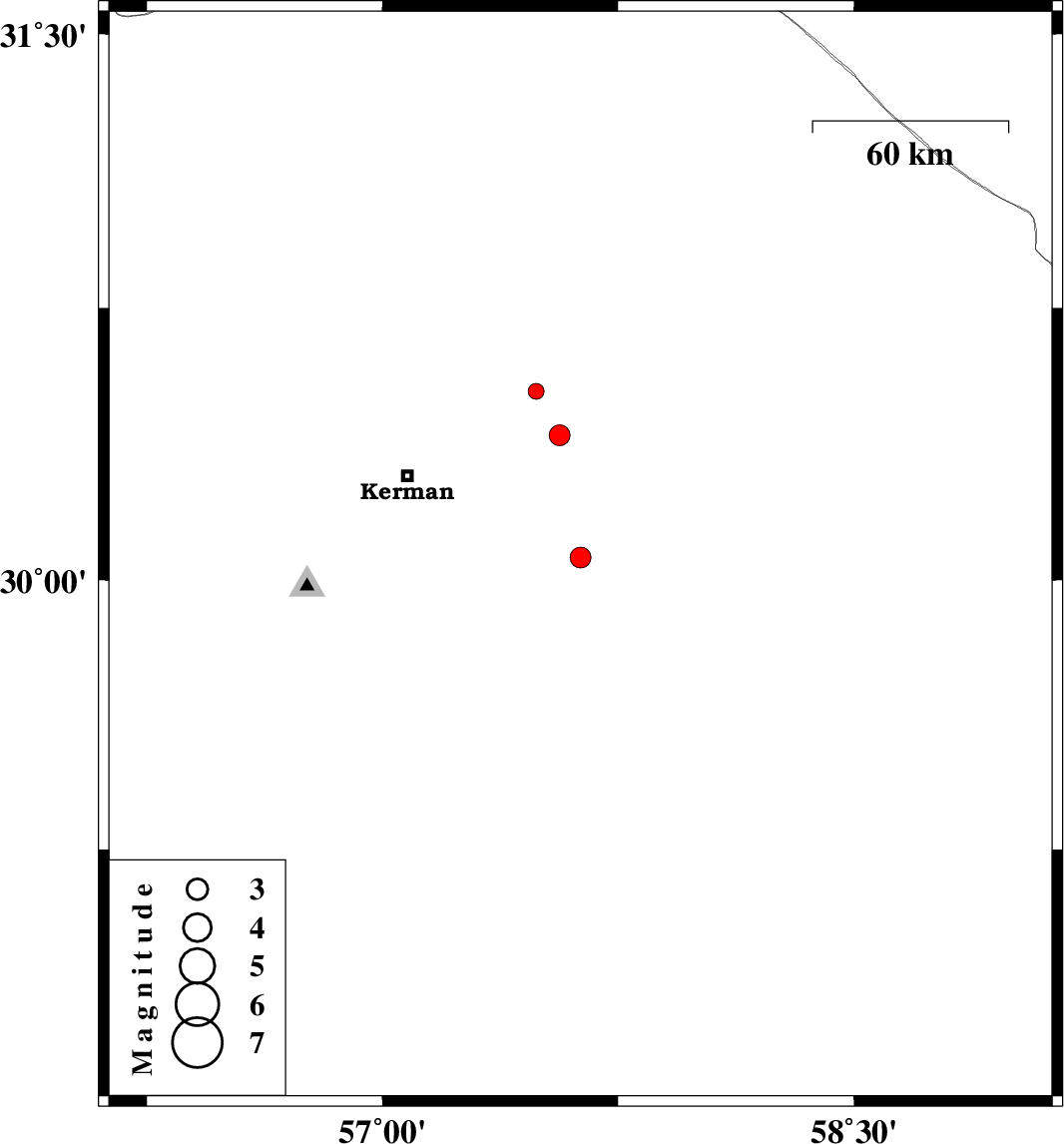 | 2015/12/20 | 04:28:21.8 | 07:58:21.8 | 30.4 | 57.564 | 14 | ML2.9 | Kerman Province, 48 km North-East of Kerman | ||
