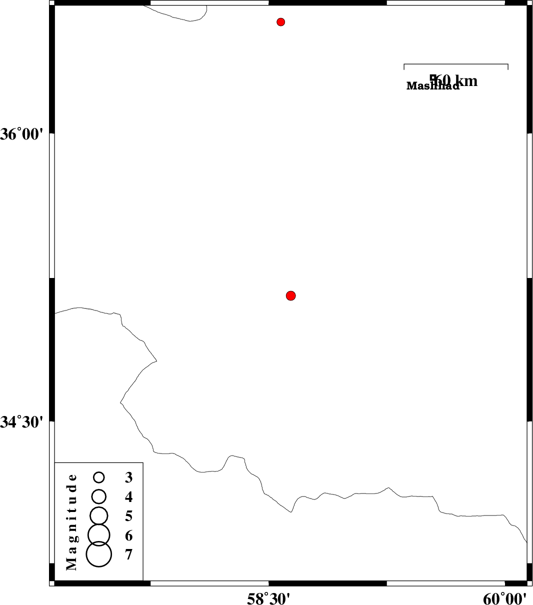 | 2015/12/27 | 02:03:00.3 | 05:33:00.3 | 35.157 | 58.64 | 18 | ML2.7 | Khorasan(center) Province, 19 km -East of Kashmar | ||
