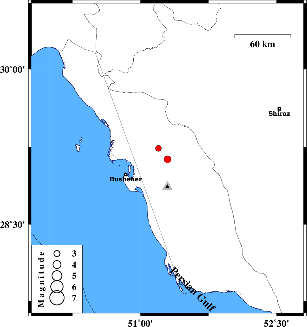 | 2015/12/31 | 12:42:11.0 | 16:12:11.0 | 29.237 | 51.198 | 15 | ML3 | Bushehr Province, 3 km of Borazjan |