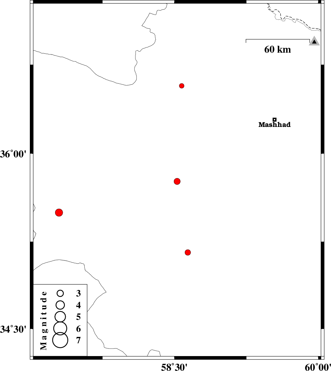| 2016/01/16 | 08:54:16.1 | 12:24:16.1 | 35.498 | 57.296 | 17 | ML3.5 | Khorasan(center) Province, 65 km North-West of Bardeskan | ||