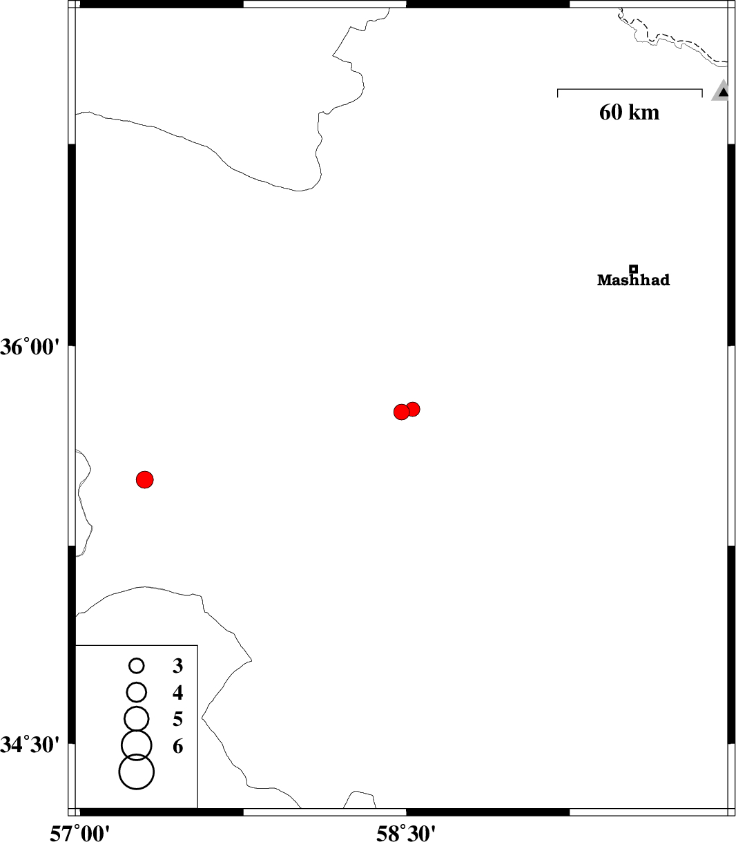 | 2016/01/16 | 08:54:16.1 | 12:24:16.1 | 35.498 | 57.296 | 17 | ML3.5 | Khorasan(center) Province, 65 km North-West of Bardeskan |