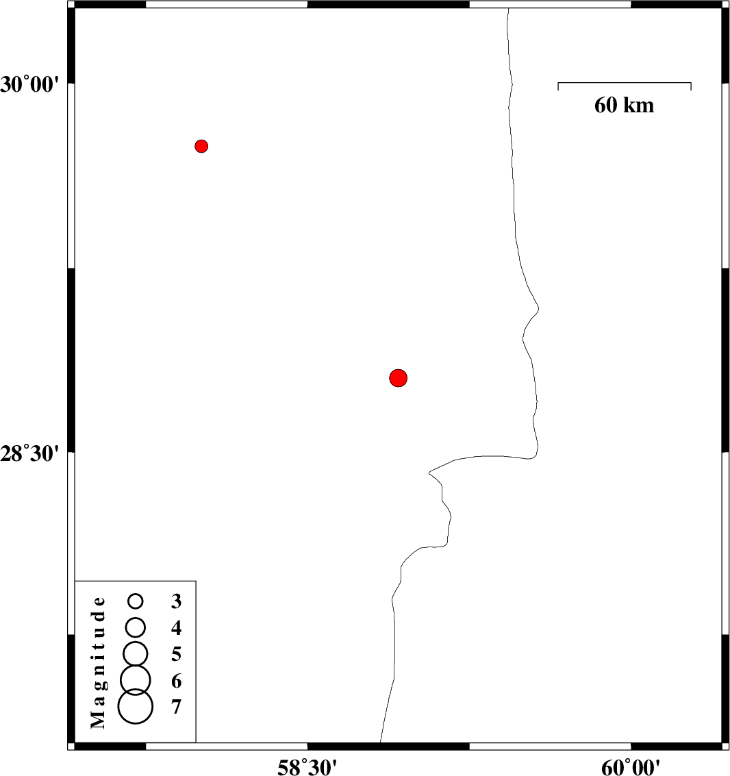 | 2016/01/22 | 06:14:33.9 | 09:44:33.9 | 29.745 | 58.007 | 14 | ML2.7 | Kerman Province, 78 km North-West of Bam |