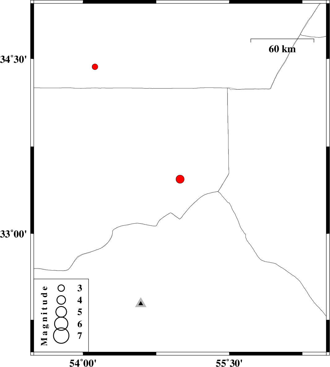 | 2016/01/28 | 13:22:29.0 | 16:52:29.0 | 33.469 | 54.995 | 15 | ML3.8 | Esfahan Province, 180 km South-West of Tabas | ||