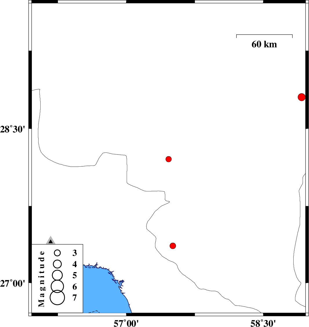 | 2016/01/24 | 23:20:38.7 | 02:50:38.7 | 28.803 | 58.92 | 29 | ML3.7 | Kerman Province, 64 km South-East of Bam |