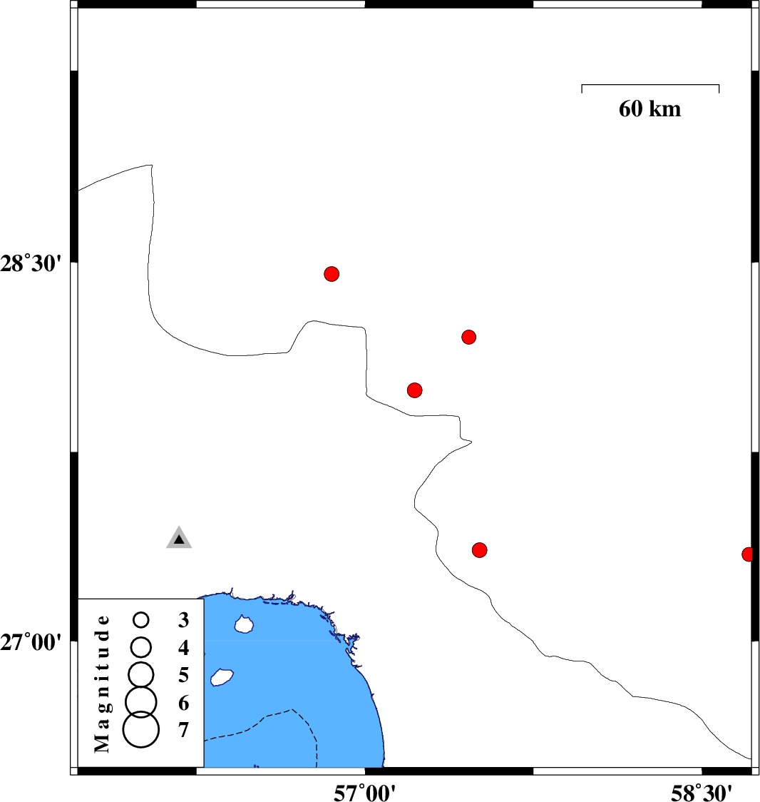 | 2016/01/02 | 17:36:17.2 | 21:06:17.2 | 27.345 | 58.71 | 15 | ML2.8 | Kerman Province, 120 km -East of Manujan |