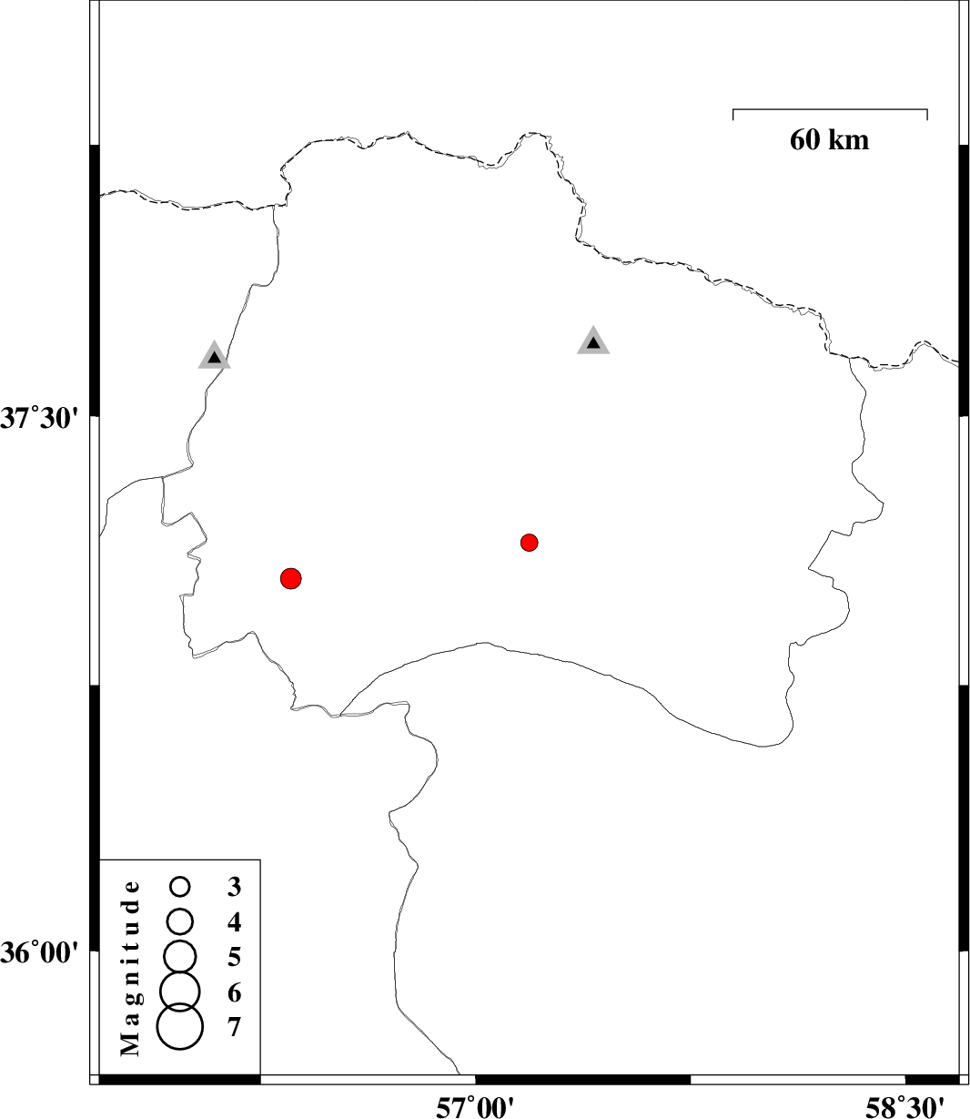 | 2016/01/31 | 08:07:54.4 | 11:37:54.4 | 37.048 | 56.356 | 7 | ML3.2 | Khorasan(north) Province, 11 km of Jajarm |