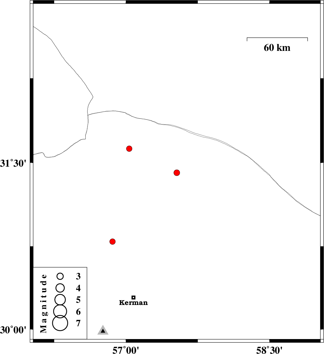 | 2016/01/28 | 04:05:14.0 | 07:35:14.0 | 31.625 | 57.034 | 18 | ML2.7 | Kerman Province, 45 km North-East of Ravar | ||