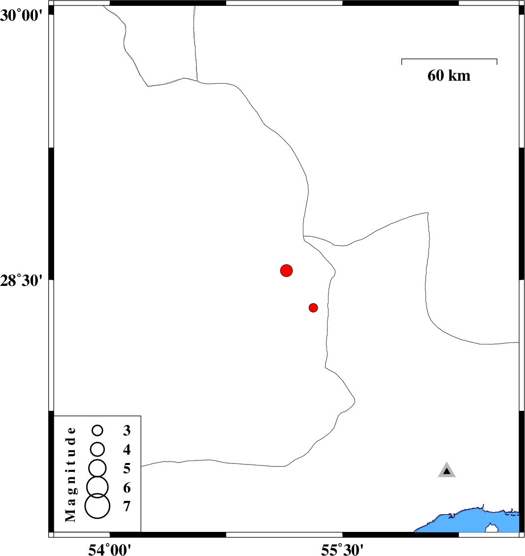| 2016/02/11 | 07:03:06.0 | 10:33:06.0 | 28.551 | 55.138 | 14 | ML3.5 | Fars Province, 63 km South-East of Darab | ||