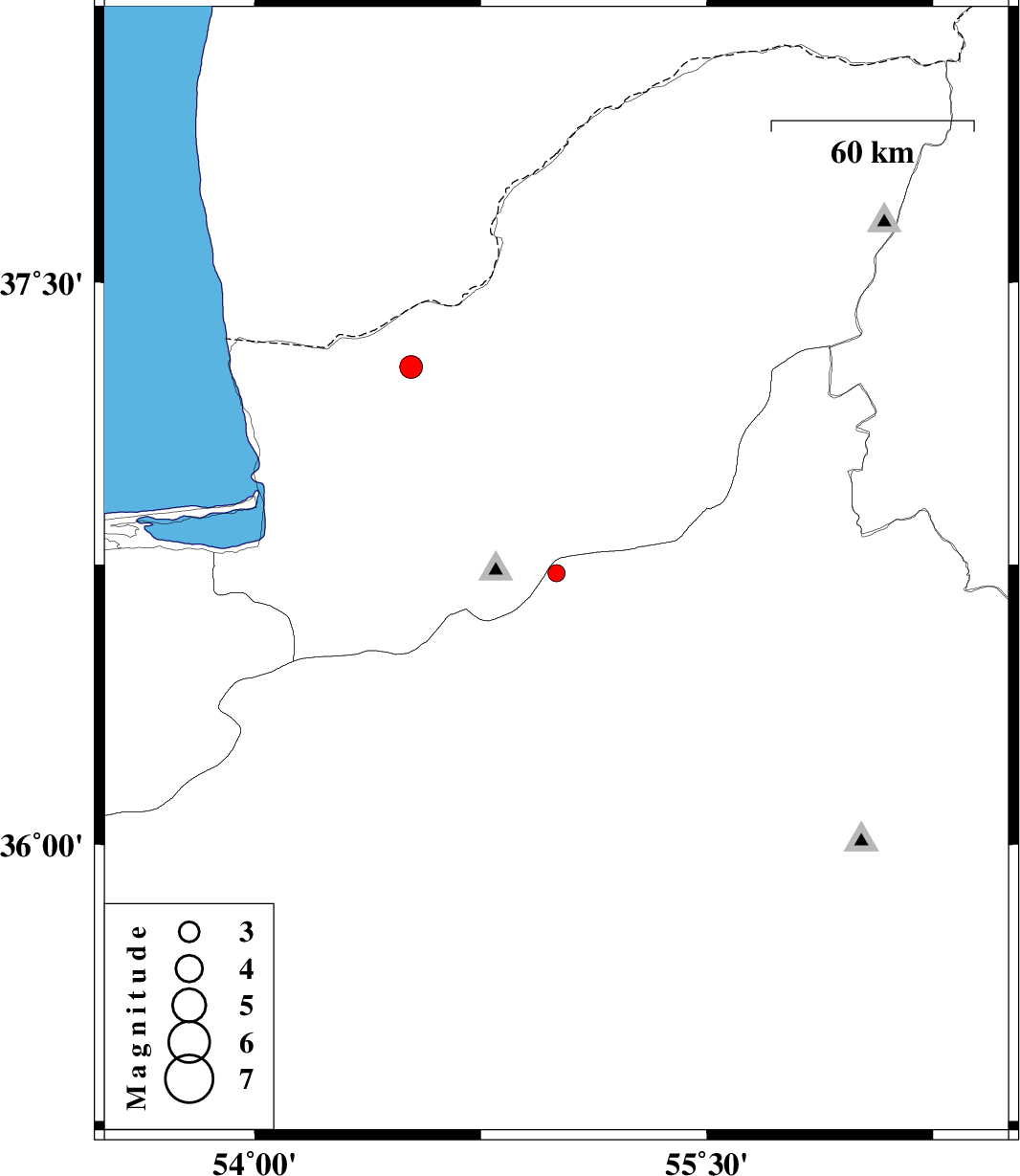 | 2016/02/13 | 01:07:06.4 | 04:37:06.4 | 37.276 | 54.518 | 18 | ML3.4 | Golestan Province, 30 km North of Aq Qaleh |