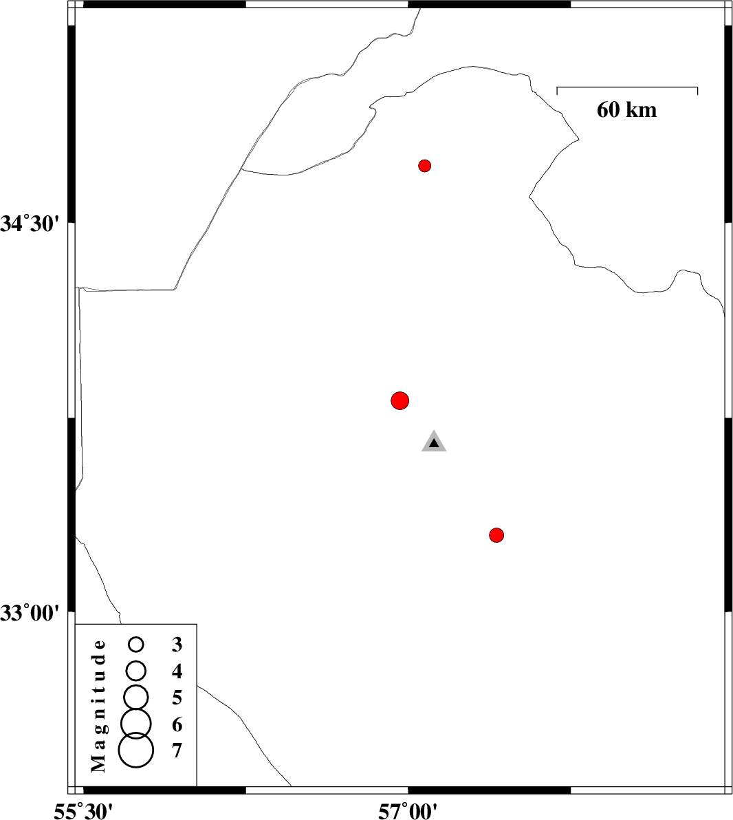 | 2016/02/10 | 22:24:02.2 | 01:54:02.2 | 33.297 | 57.407 | 15 | ML2.9 | Yazd Province, 56 km South-East of Tabas | ||