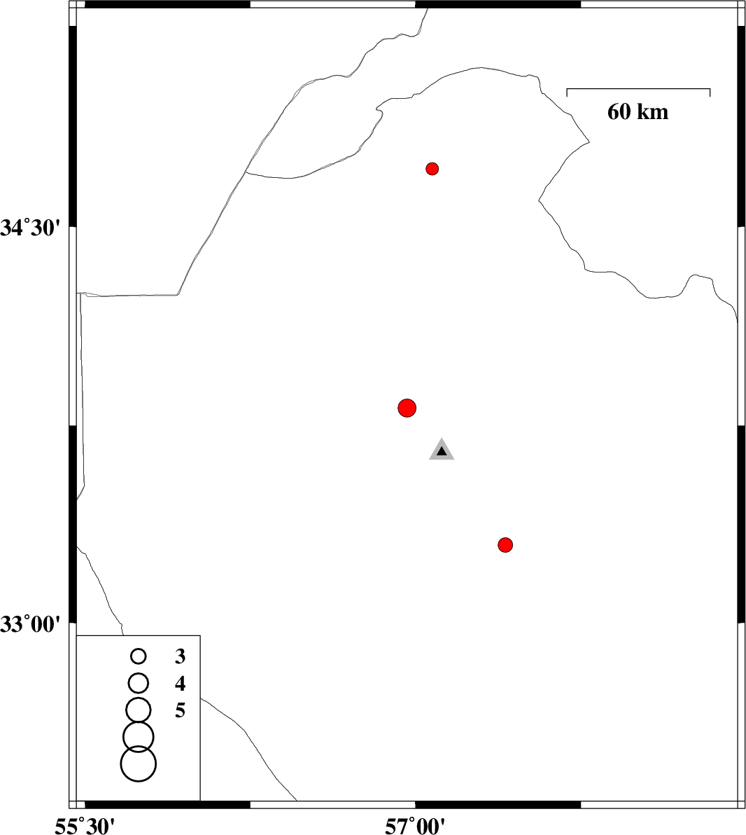 | 2016/02/10 | 22:24:02.2 | 01:54:02.2 | 33.297 | 57.407 | 15 | ML2.9 | Yazd Province, 56 km South-East of Tabas |