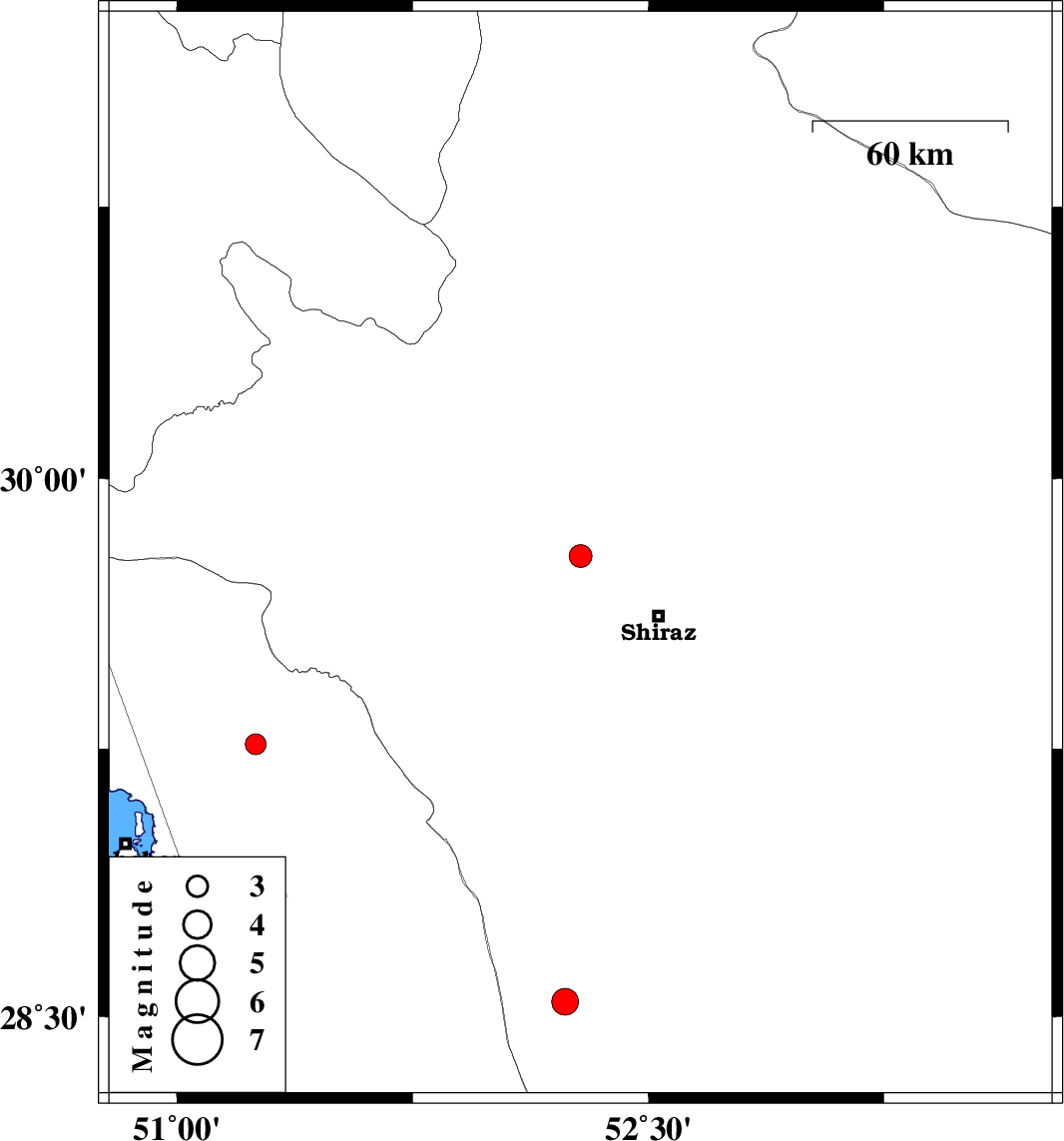 | 2016/01/30 | 11:59:34.4 | 15:29:34.4 | 29.262 | 51.251 | 6 | ML3 | Bushehr Province, 4 km of Borazjan |