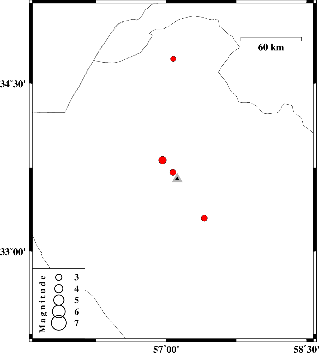 | 2016/02/24 | 06:59:26.1 | 10:29:26.1 | 33.708 | 57.072 | 14 | ML3 | Yazd Province, 18 km North-East of Tabas | ||