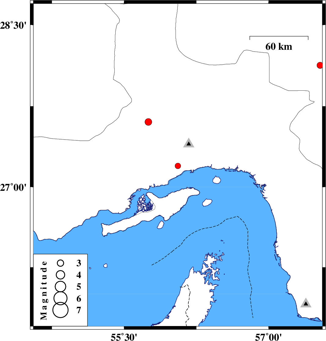 | 2016/02/20 | 01:42:12.7 | 05:12:12.7 | 28.128 | 57.535 | 14 | ML2.9 | Kerman Province, 25 km North-West of Kahnuj |