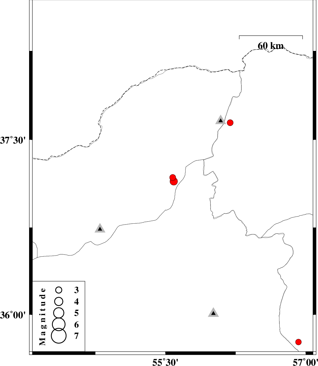 | 2016/03/13 | 03:03:19.6 | 06:33:19.6 | 37.146 | 55.589 | 15 | ML3.6 | Golestan Province, 20 km -East of Minodasht | ||