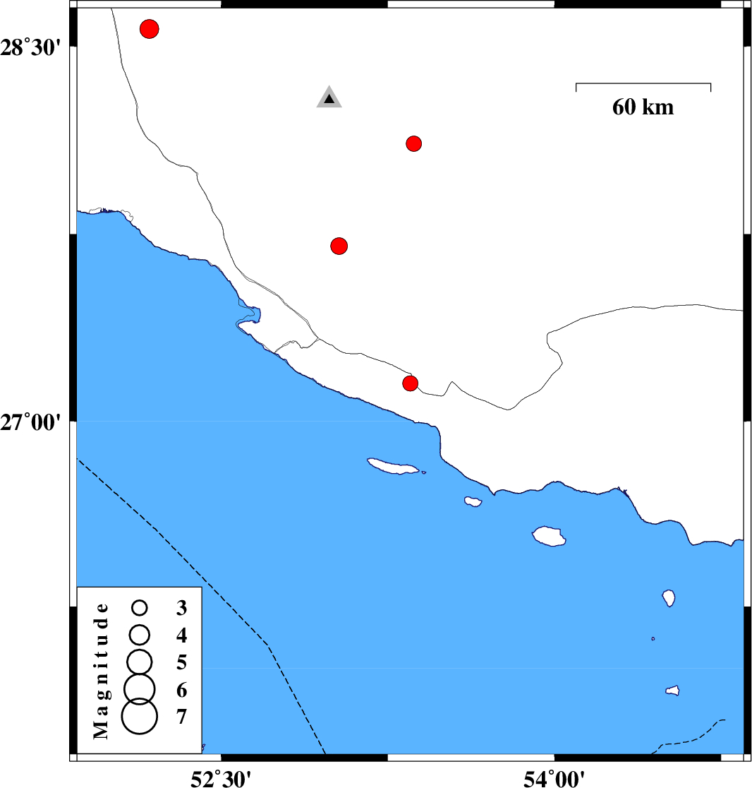 | 2016/03/19 | 22:57:26.9 | 02:27:26.9 | 28.112 | 53.367 | 15 | ML3.1 | Fars Province, 47 km South-West of Jahrom |